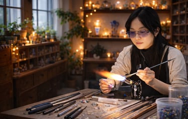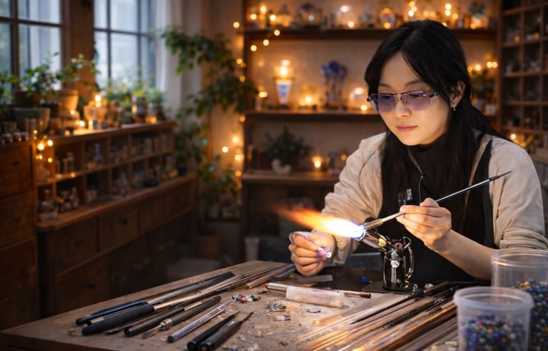 Each piece is individually handmade using traditional lampworking techniques, shaped slowly in the flame and finished by hand. No molds, no mass production — every creation is one of a kind, with its own character and subtle variations.