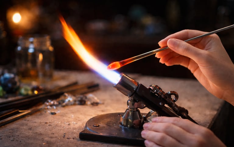 Glass rods are slowly heated over an open flame until molten, then carefully shaped by hand. This process requires steady control, experience, and time. No molds are used, and no two pieces are ever exactly the same.